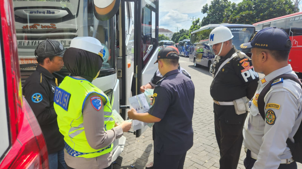 Dalam pemeriksaan tersebut, petugas melakukan pengecekan kelengkapan administrasi pengemudi dan kendaraan, seperti SIM dan STNK, serta kondisi teknis bus yang meliputi sistem pengereman, lampu penerangan, ban, dan perlengkapan keselamatan lainnya. Pemeriksaan dilakukan secara menyeluruh untuk memastikan kendaraan laik jalan sebelum beroperasi.